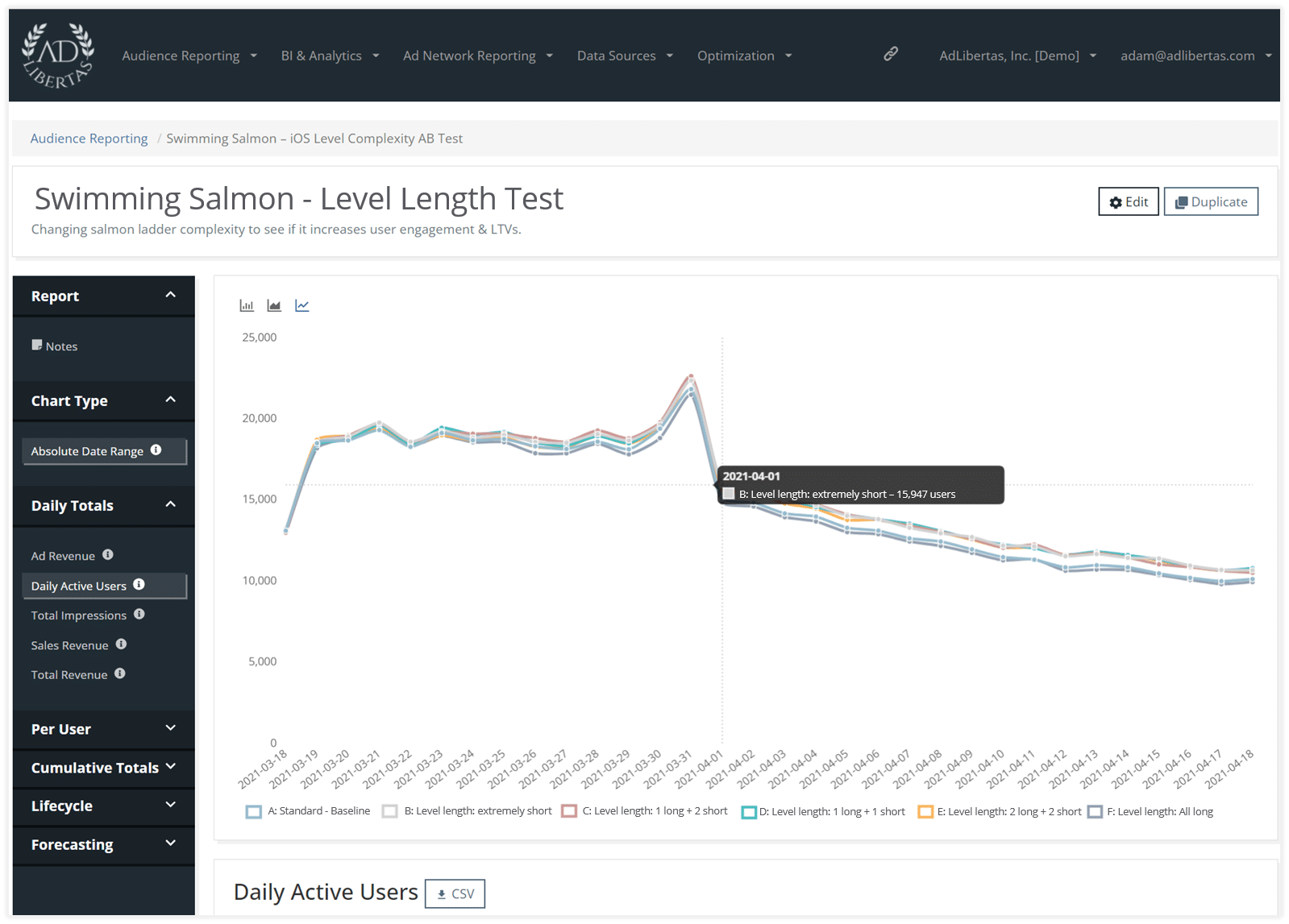 In way of example, let’s consider an (anonymous) app. This app “Swimming Salmon” is running Firebase AB tests and an ad mediator (e.g. Admob, ironSource, Applovin MAX, or MoPub) to monetize users via advertising. The AdLibertas platform is collecting the Firebase analytics, AB tests, and user information and combining them with the ad impressions.